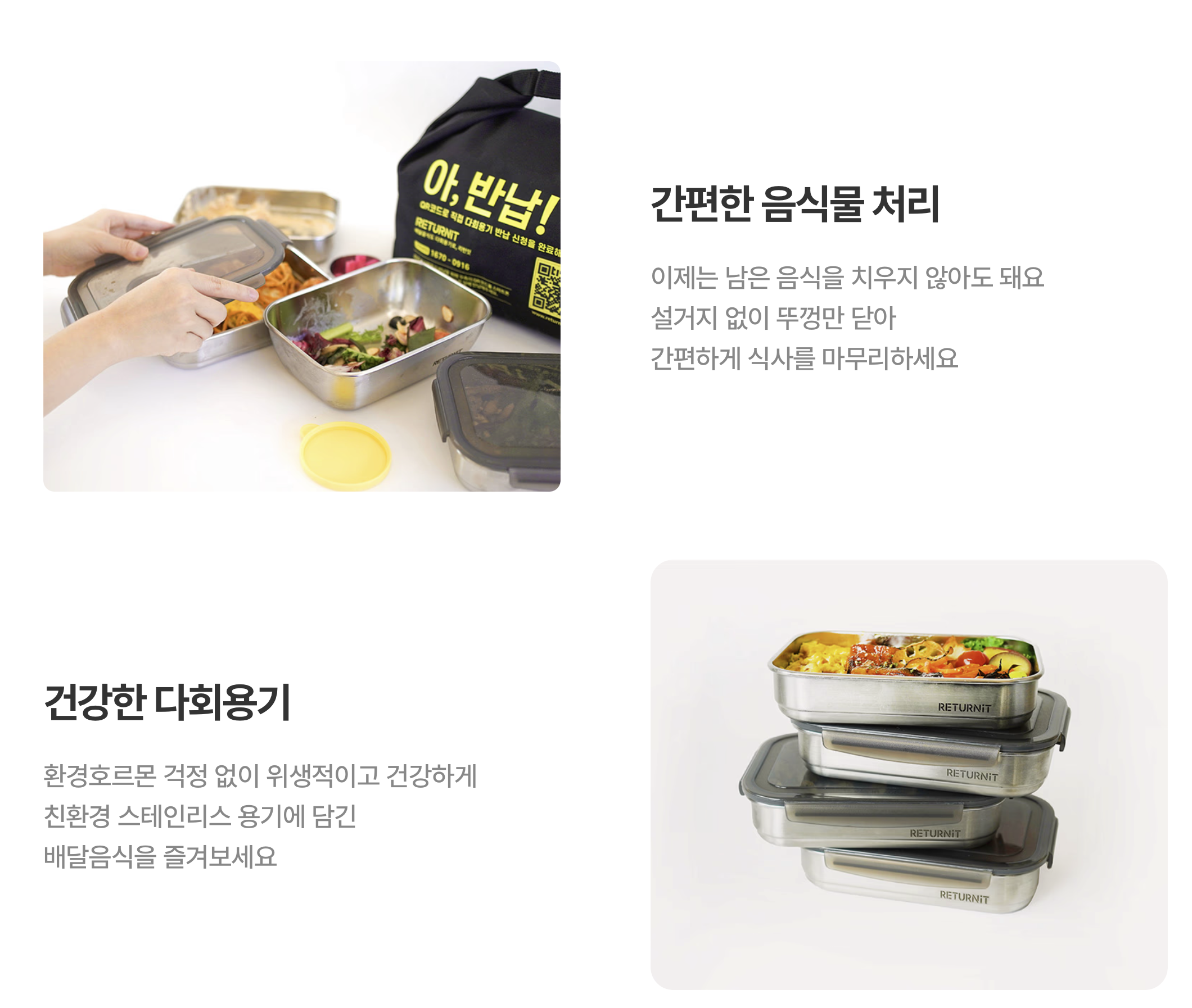 리턴인 다회용기는 스테인리스 용기를 사용해서 위생적이기도 하고 무엇보다 일반 플라스틱보다 보온이 훨씬 잘되어서 음식을 더욱 따뜻하게 받을수 있더라고요. 게다가 다 먹고 나면 설거지를 할 필요도 없고 뚜껑만 닫아서 원래 왔던 가방에 다시 담기만 하면 됩니다.