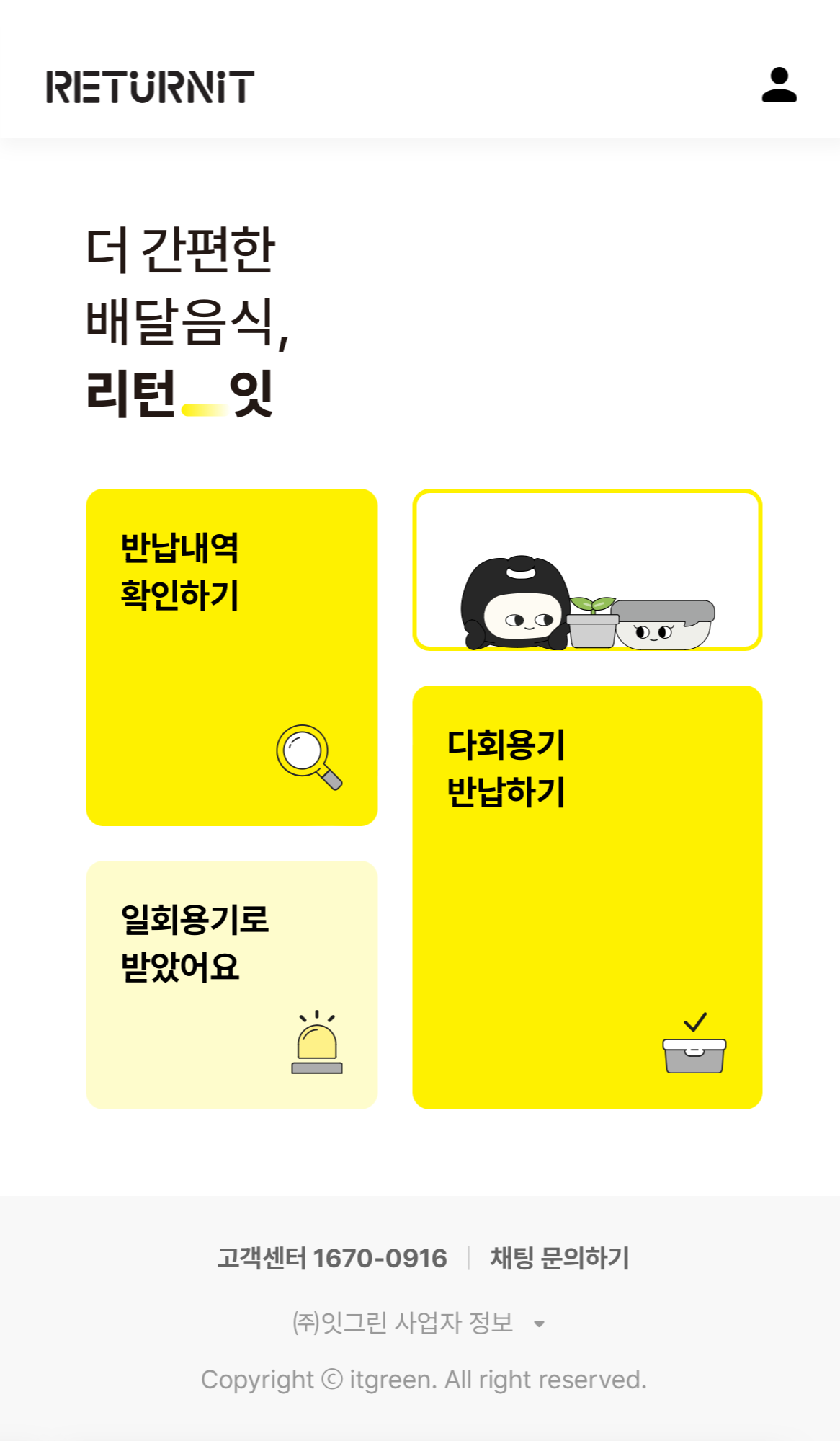반납도 간편하게 폰으로 신청만 하면 기사님이 알아서 수거해 가시기 때문에 전혀 불편하고 귀찮은 것이 없어요. 이번 리턴잇 사용을 계기로 다회용기 사용에 대한 인식이 좋아지면서 환경을 조금 더 신경 쓸 수 있게 될 것 같아요.